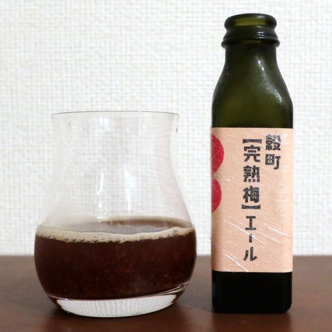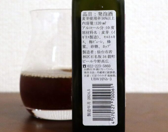 以前、仙台に行った時に駅で購入したビール、穀町「完熟梅」エールをいただきました。購入したのは去年の10月なので約4ヶ月、ちょっと時間が経ってしまいました。容量はお土産(お試し?)サイズで 120ml なので、いつもとは違うグラスでいただきます。