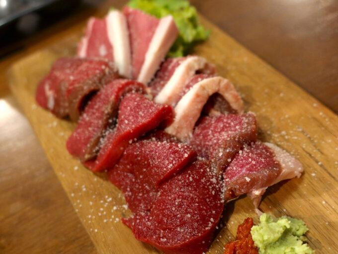 こっちが鹿でこっちが猪、というのは赤身だけだとわかりませんでした。猪の方が脂があるので、ビールとの相性が良かったです。