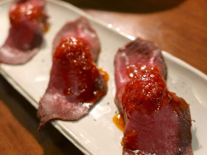 焼肉以外のメニューもいくつかいただきました。こちらはお子サマー用に頼んだ鹿肉ロースト寿司(3貫520円)です。
