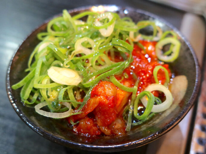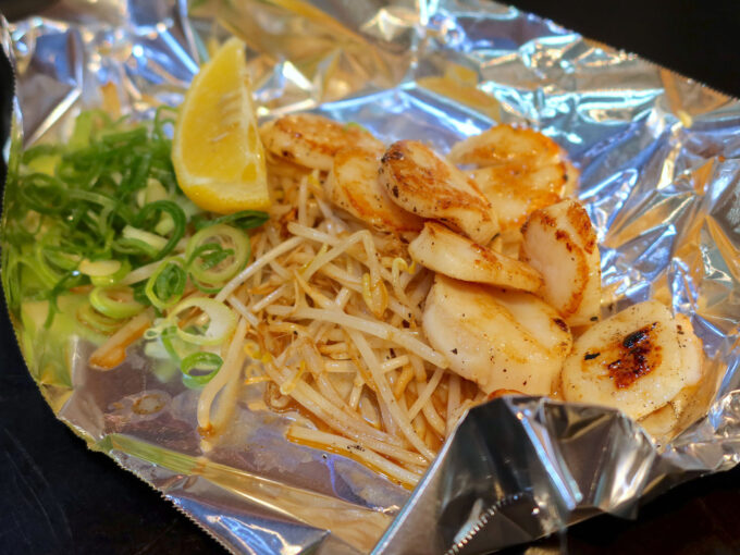 ごま油がしっかりとかかったチャンジャで、少しまろやかな分、ビールとの相性もいいです。つまみながら待っていると貝柱塩焼(1,520円)の登場です。こちらのお店は、テーブルに鉄板がありますが、自分たちで焼くのではなく、調理されたものが提供される形式のようですね。