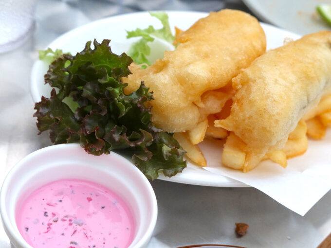 鱈のフィッシュ&チップス(780円)にはピンク(紫?)のソースがついていました。