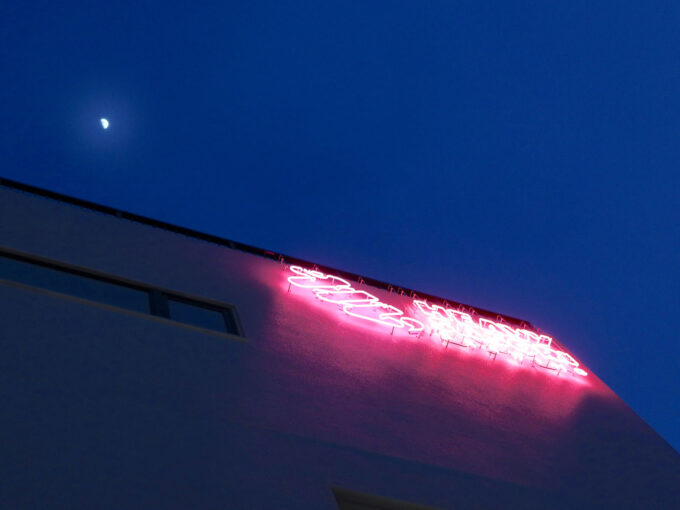 テラス席は外がだんだんと暗くなっていくのを感じられていいですし、キレイな月とピンクのサインを楽しむこともできました。